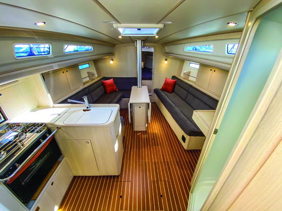 - Båden er en performance cruiser med lidt større storsejl end Arcona 340. Den har også separat brusekabine og man kan vælge mellem rorpind eller dobbeltrat styring, siger importør Ove Skovgaard-Mortensen fra Hundige.