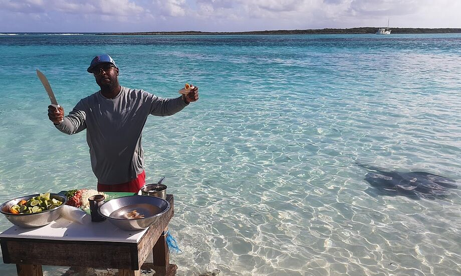 Med 40 knob ankom vi - efter et kvarters sejlads til en lille ø, hvor vi i en lille bananbåd blev sejlet ind til land, for at fodre små og store, svømmende grise med honningmelon på en pind. Noget Bahamas også er kendte for.