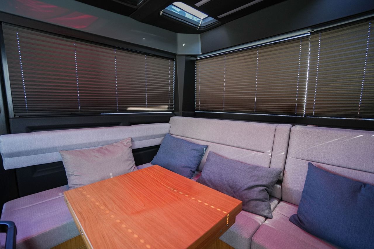 Indvendigt mødes skandinavisk minimalisme med italiensk formsans. Resultatet er et interiør, der ikke forsøger at imponere – det gør det bare. Bløde, lydabsorberende paneler, naturlige materialer og diskret LED-lys skaber en rolig og elegant atmosfære.