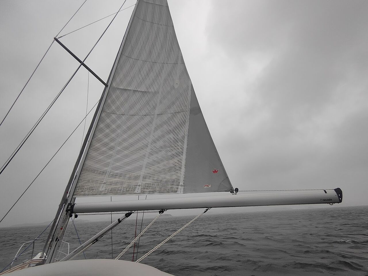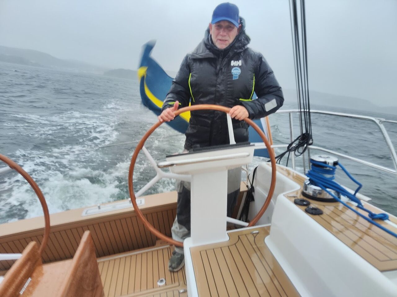 Vi testede båden i et forfærdeligt regn- og blæsevejr i Ellös i slutningen af november, udfor Hallberg-Rassy værftet. Vi var ude i en time og sejlede for meget flade og rebet Elvstrøm Epex-sejl med en Seldén mast med automatisk rulle, fokken var også rebet helt i bund.