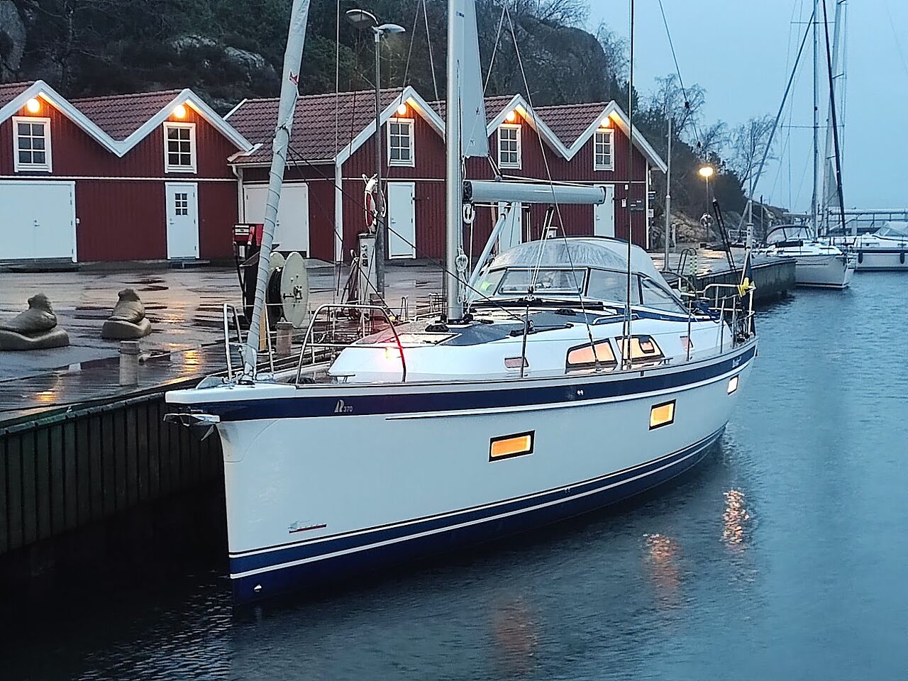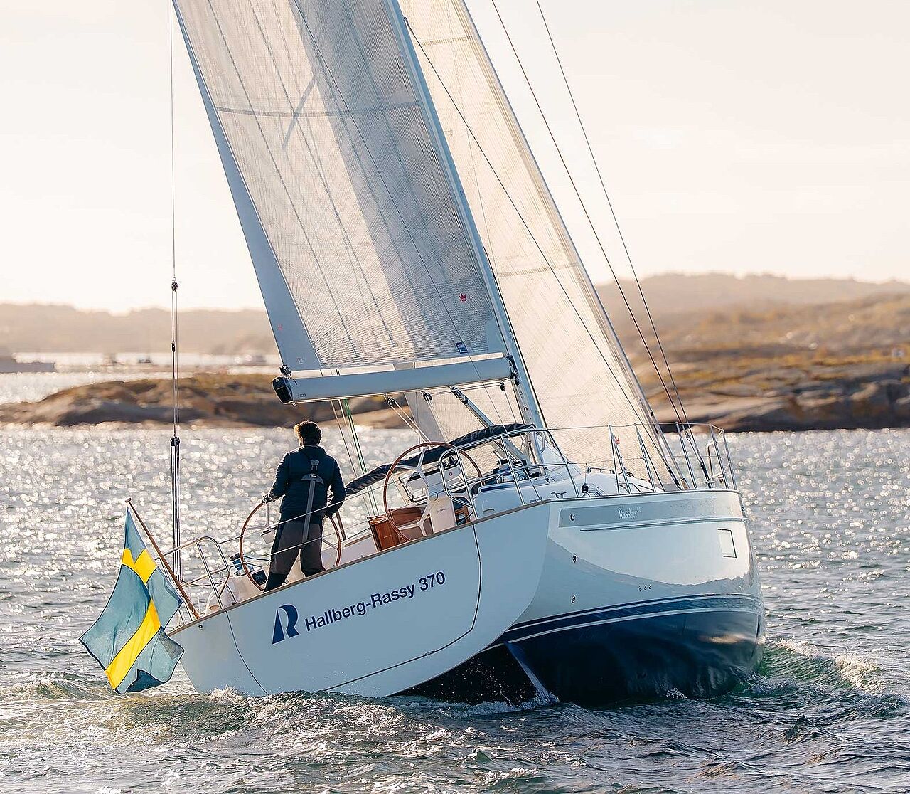 Værftsikonet Hallberg-Rassy løfter sløret for en ny model: Hallberg-Rassy 370. Det berømte Frers Yacht Design slår linjerne med et bredt agterskrog, tvillingror, blykøl og bovspryd. Vi testede båden nord for Gøteborg i sidste uge i 14 m/sek. og massiv regn. Se svenskeren på boot-udstilling.