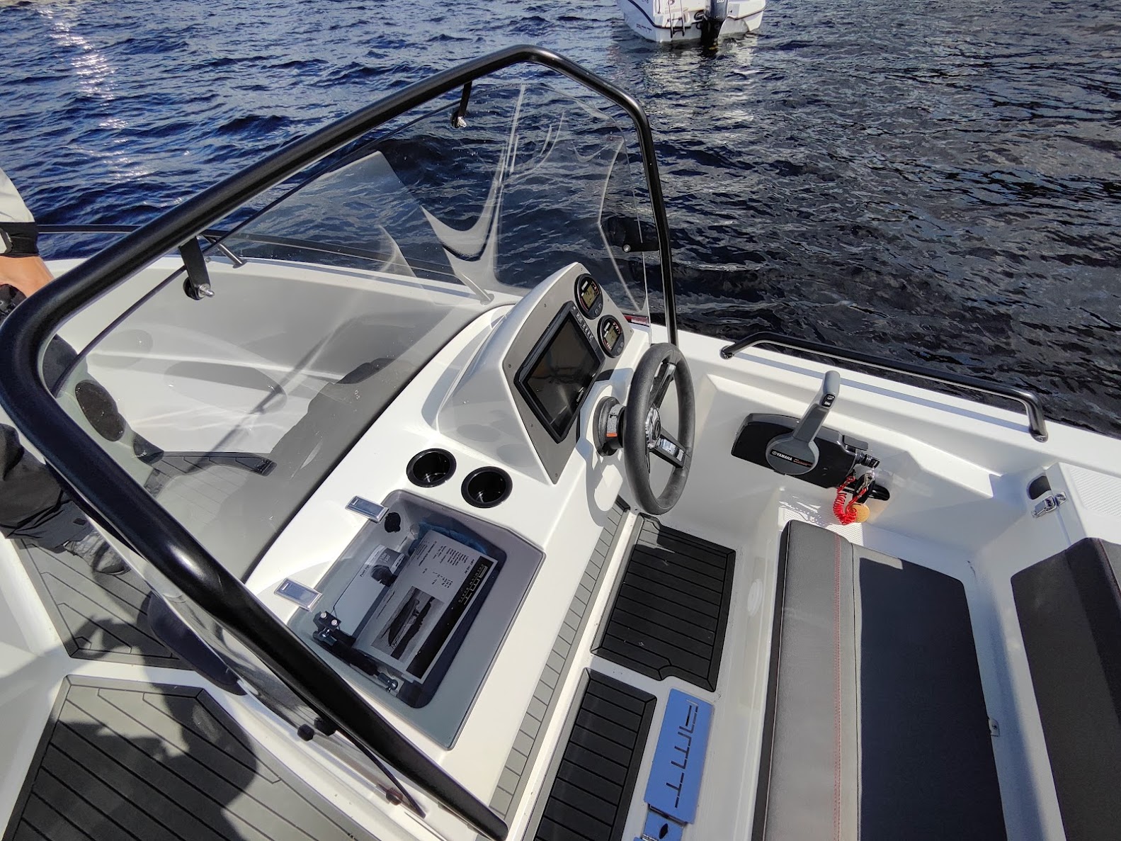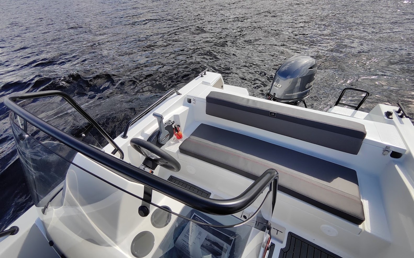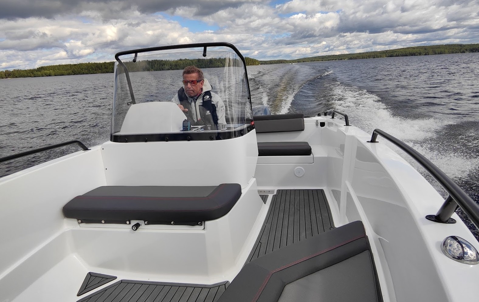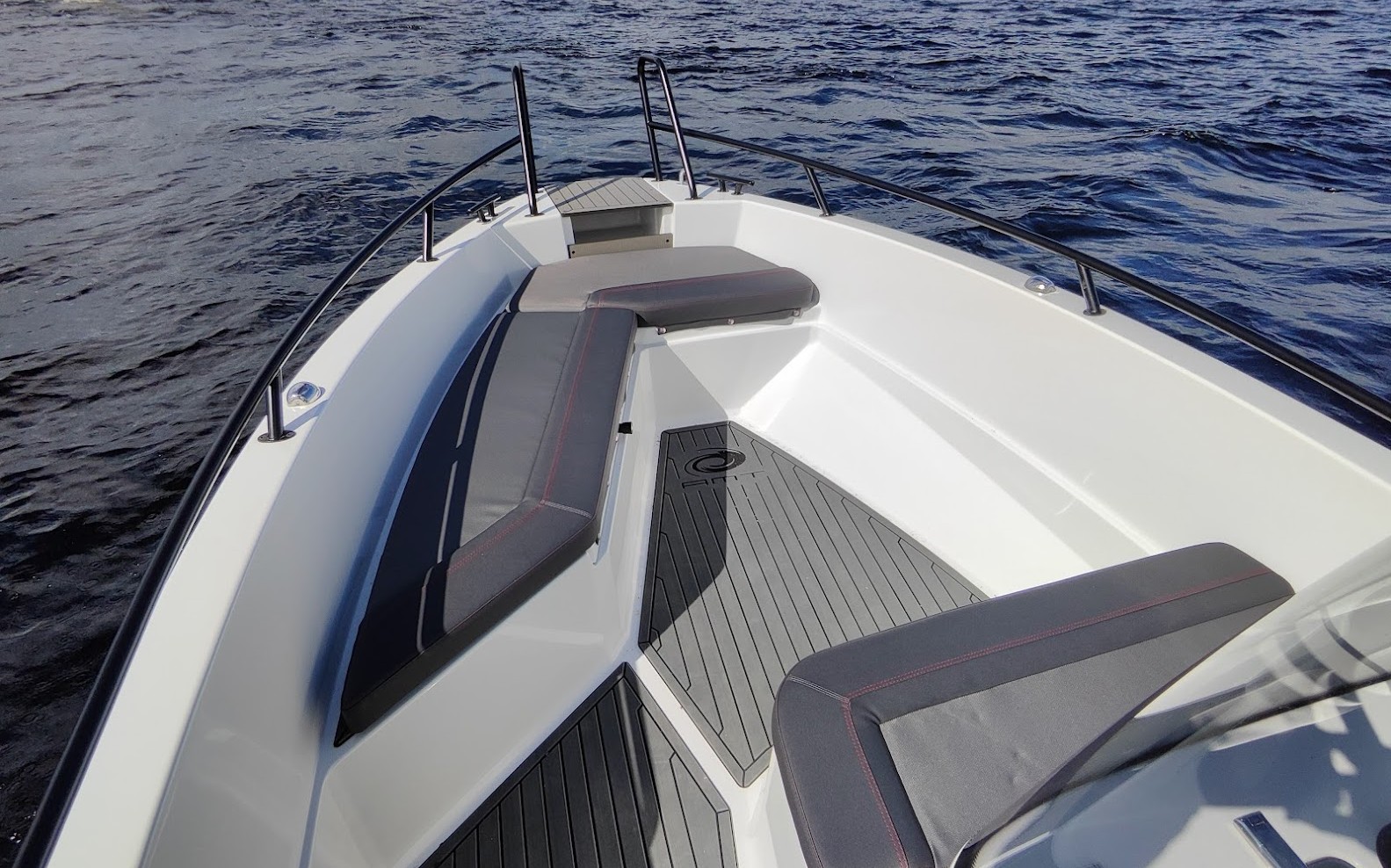 Standardudstyr: Gråt dækoverflade, synkefri Always to shore-konstruktion, komfortsæder, Dryfeel-hynder, integrerede Abloy-låse, rustfri greb, fast tank, benzinfilter, LED-navigationslys, 12V-udtag, automatisk lænsepumpe, brandslukker, Securmark-tyverimærkning.
