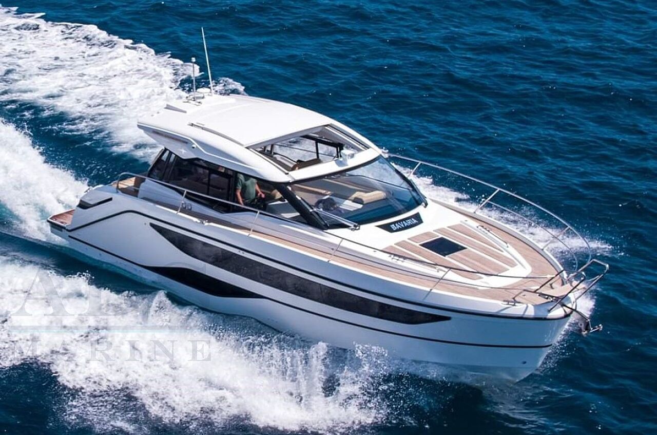 Motorbåden Bavaria SR 38 HT fremvises som en moderne hardtop-cruiser med fokus på komfort og brugervenlighed.