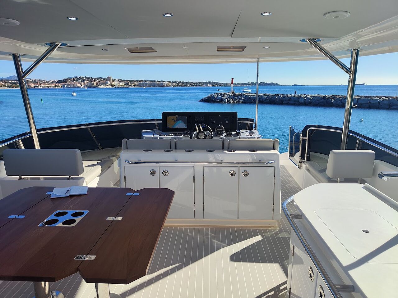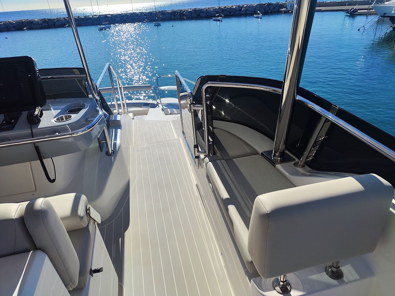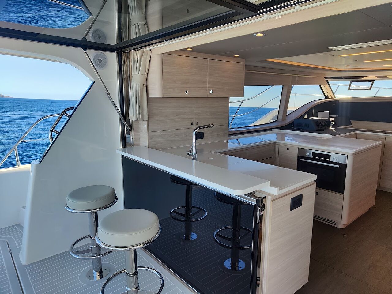 Designet er gennemført i hverdagen: Agtervindue i salonen kan løftes op, så barløsningen åbner mod cockpit. Hoveddøren glider til side, og inde- og uderum smelter sammen. Flybridge med wetbar bliver naturligt samlingspunkt, mens LED-belysning giver sikker færden efter mørkets frembrud.