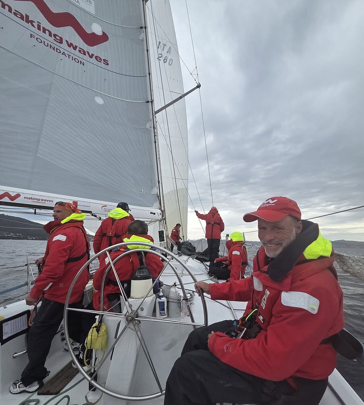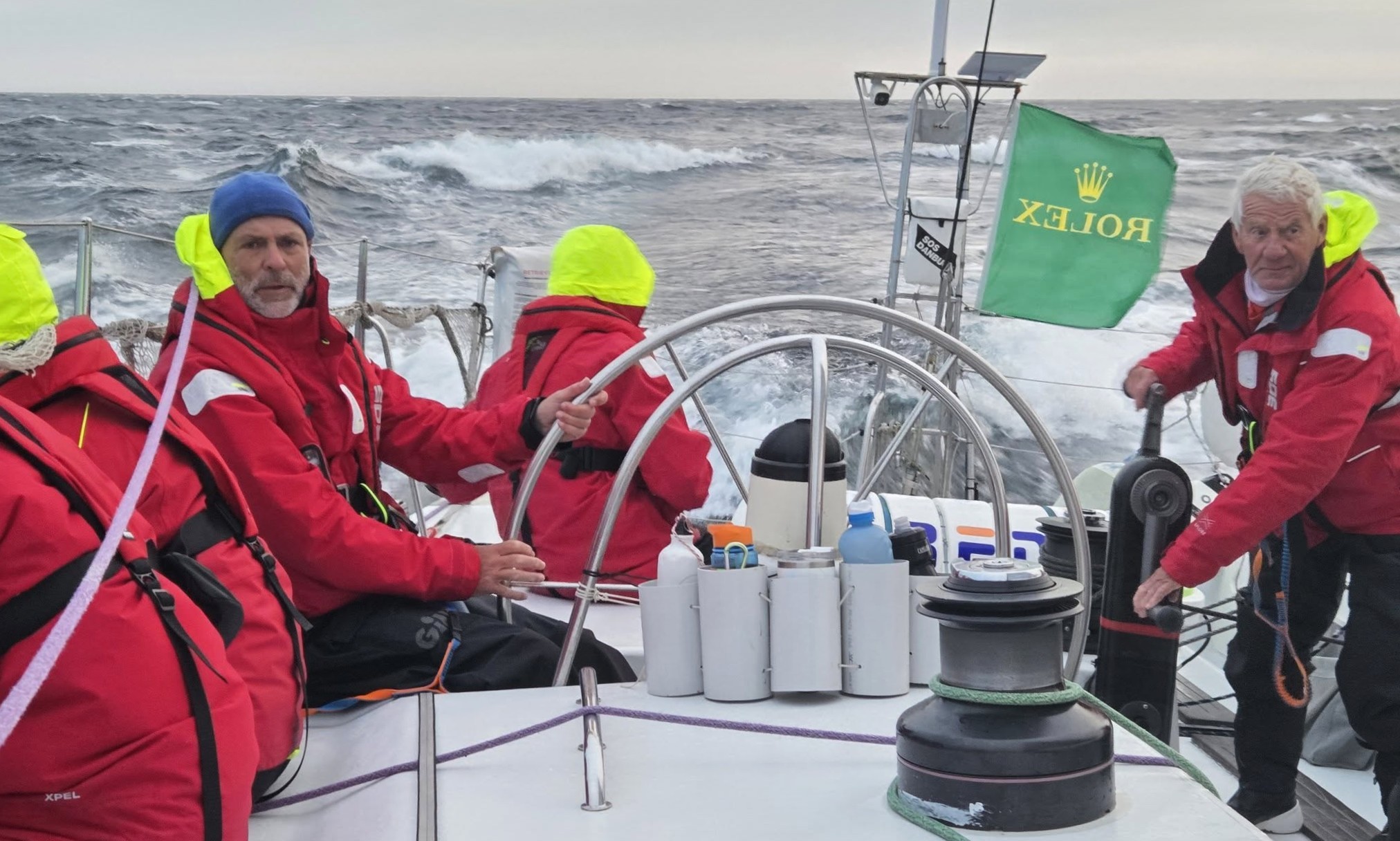 På en 54-fods båd, der sejler omkring 10 knob i den vind, giver det ikke meget tid mellem vendingerne. Heldigvis var skipper fuldstændig rolig. Han har sejlet Sydney–Hobart 30 gange før, navigatøren 19 gange, og samlet set havde vi 98 gennemførte Hobarts ombord.