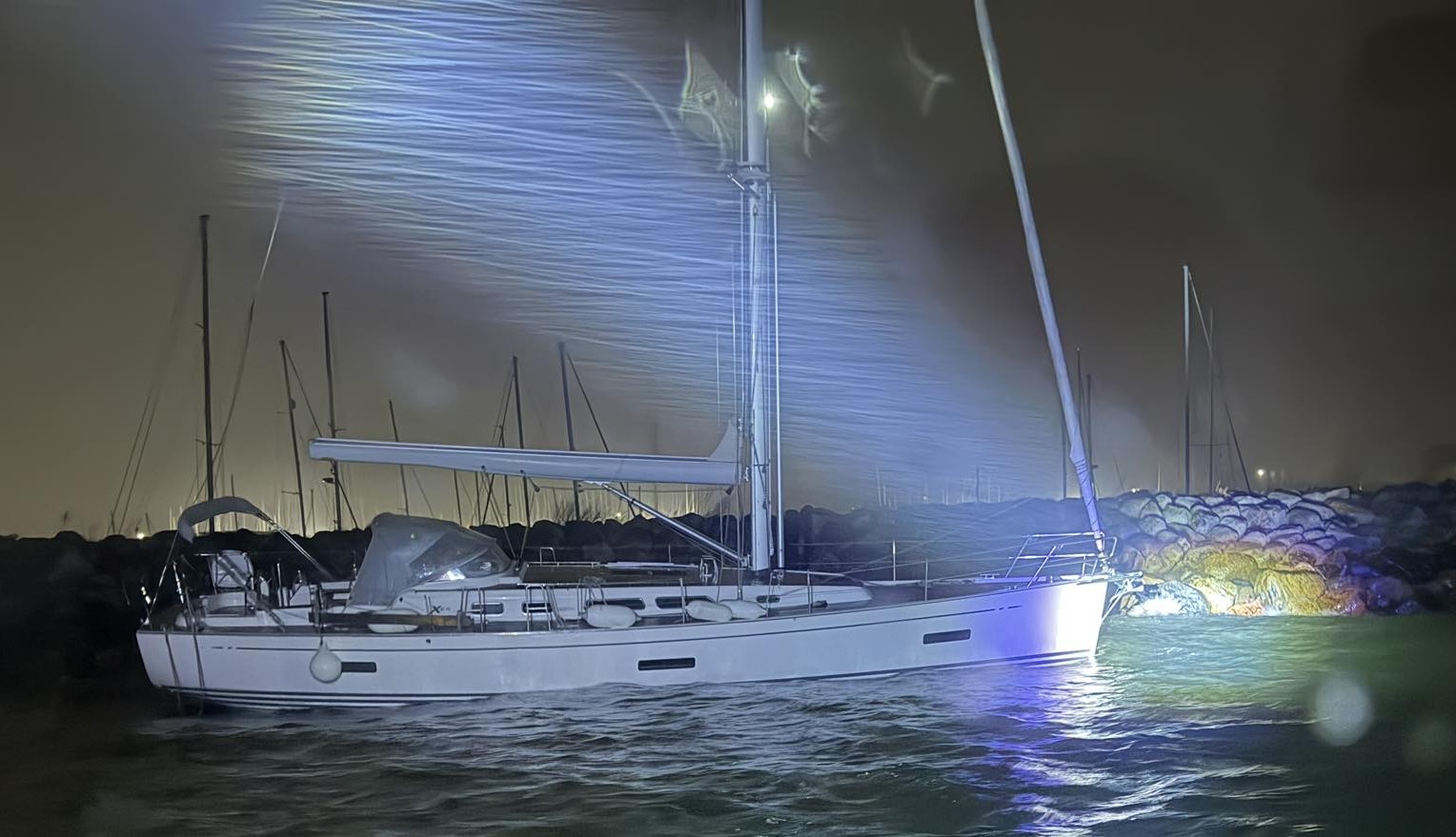 En sejlbåd af typen X-Yachts XC 45 endte sent fredag aften på grund ved indsejlingen til Egå Marina og blev slået hårdt mod stenene på mellemmolen. Båden tog hurtigt store mængder vand ind, og der stod senere op mod halvanden meter vand i kahytten.