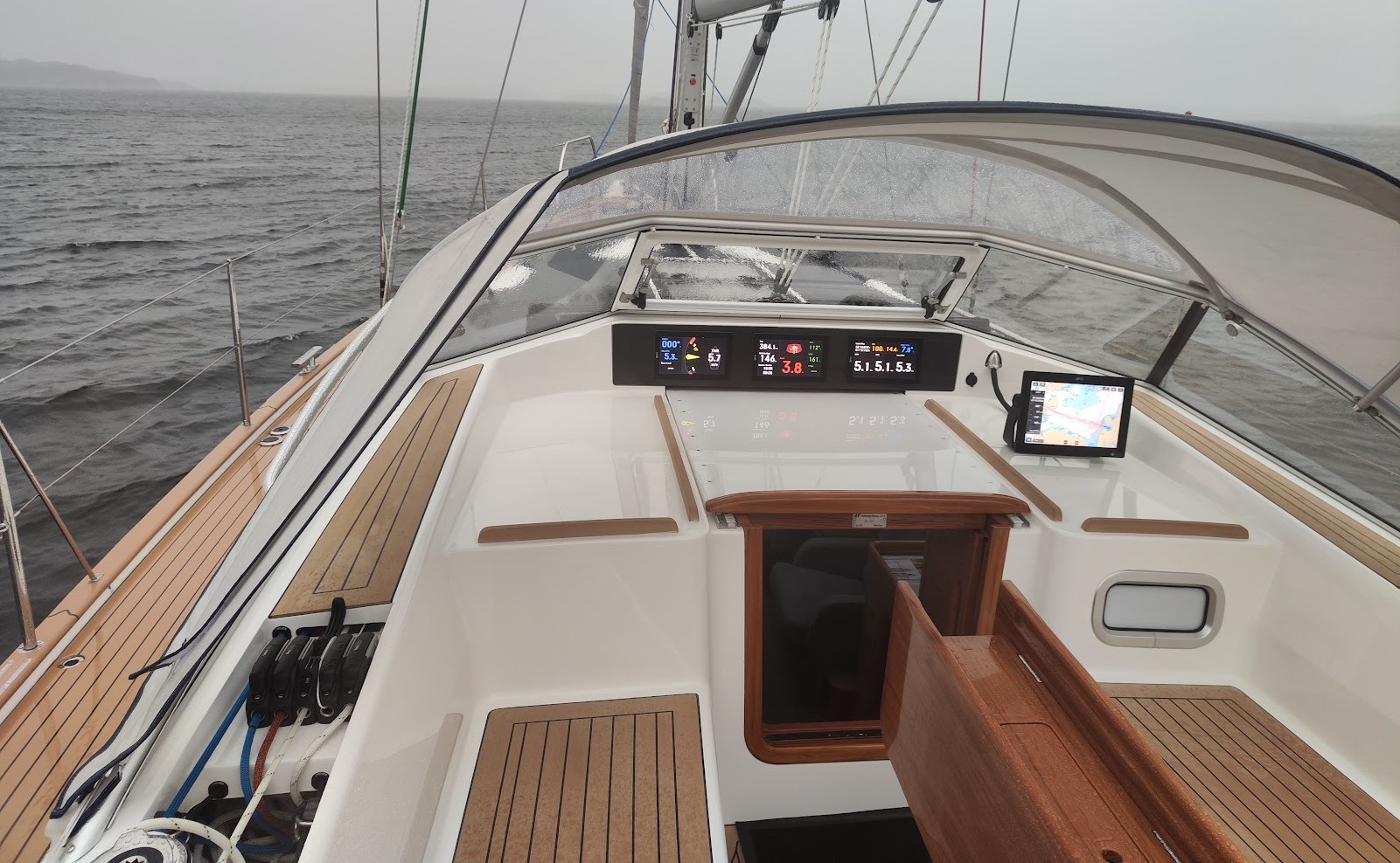 De elektriske Lewmar-spil gjorde det let at trimme både fok og storsejl i de barske forhold, og den elektriske Seldén-rullemast gjorde rebning af storsejlet hurtig og sikker.