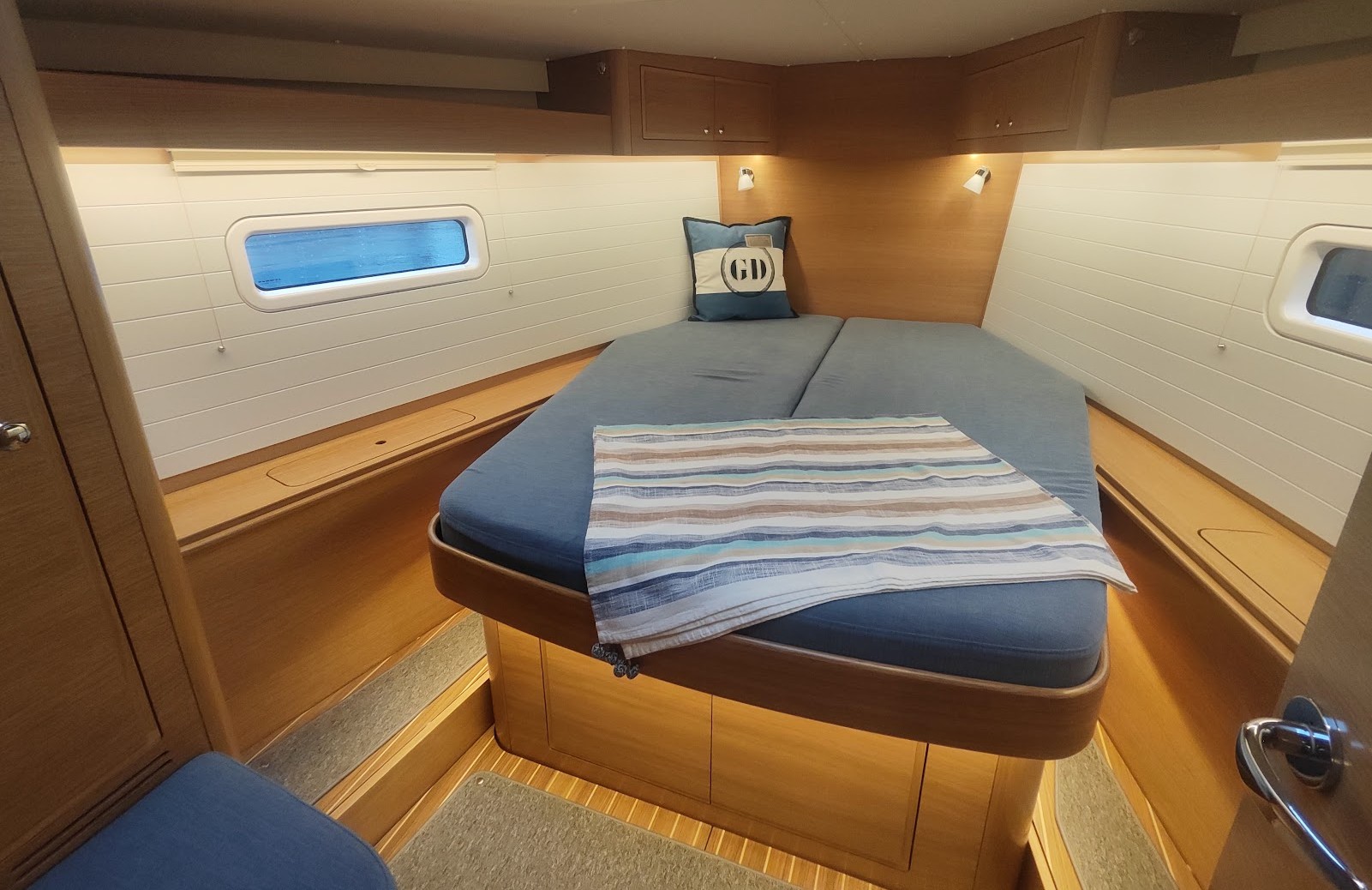 Agterkahytten er lys takket være et stort skrogvindue, mens forkahytten drager fordel af den nye mastplacering og tilbyder en af klassens bredeste køjer.