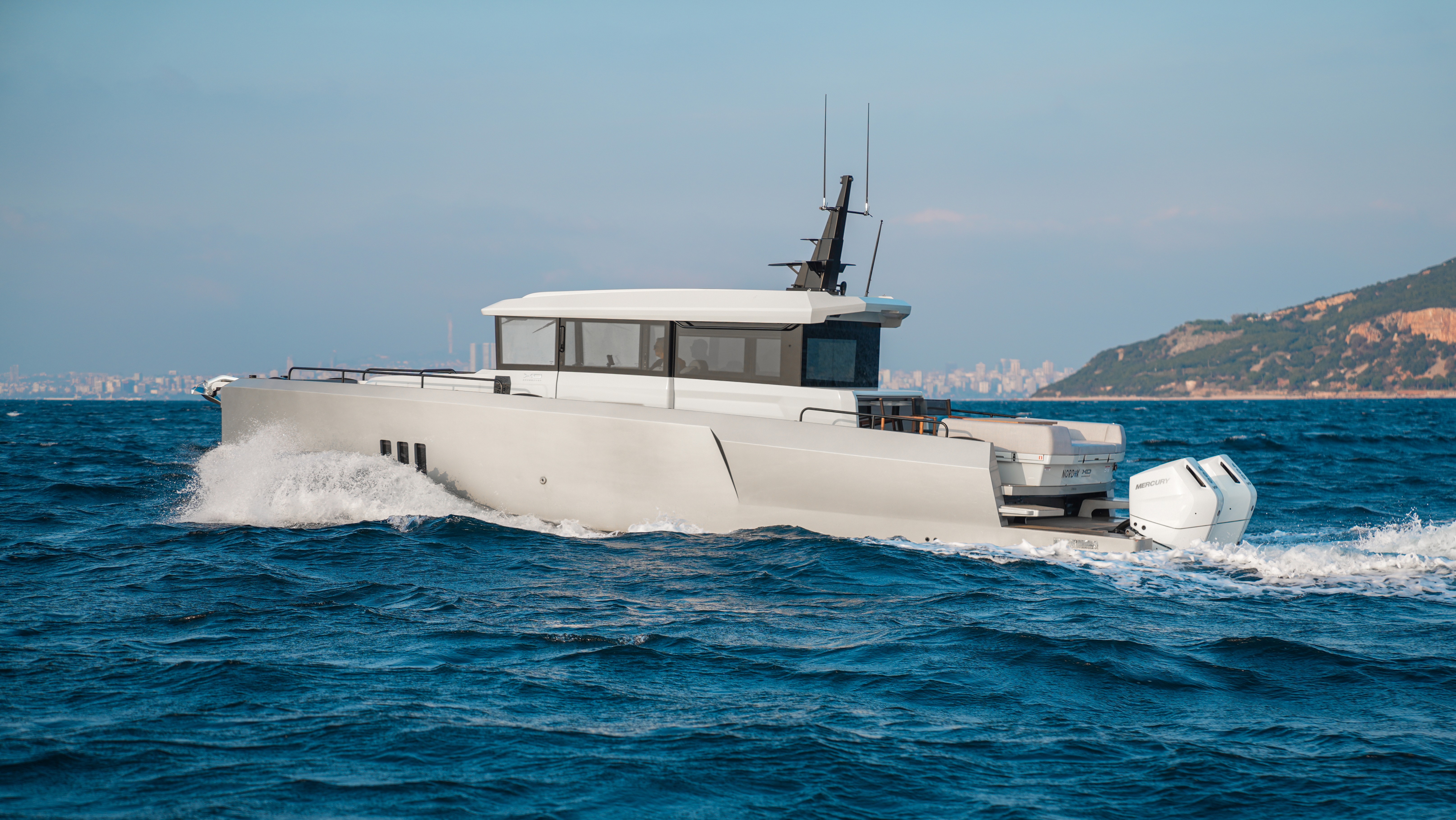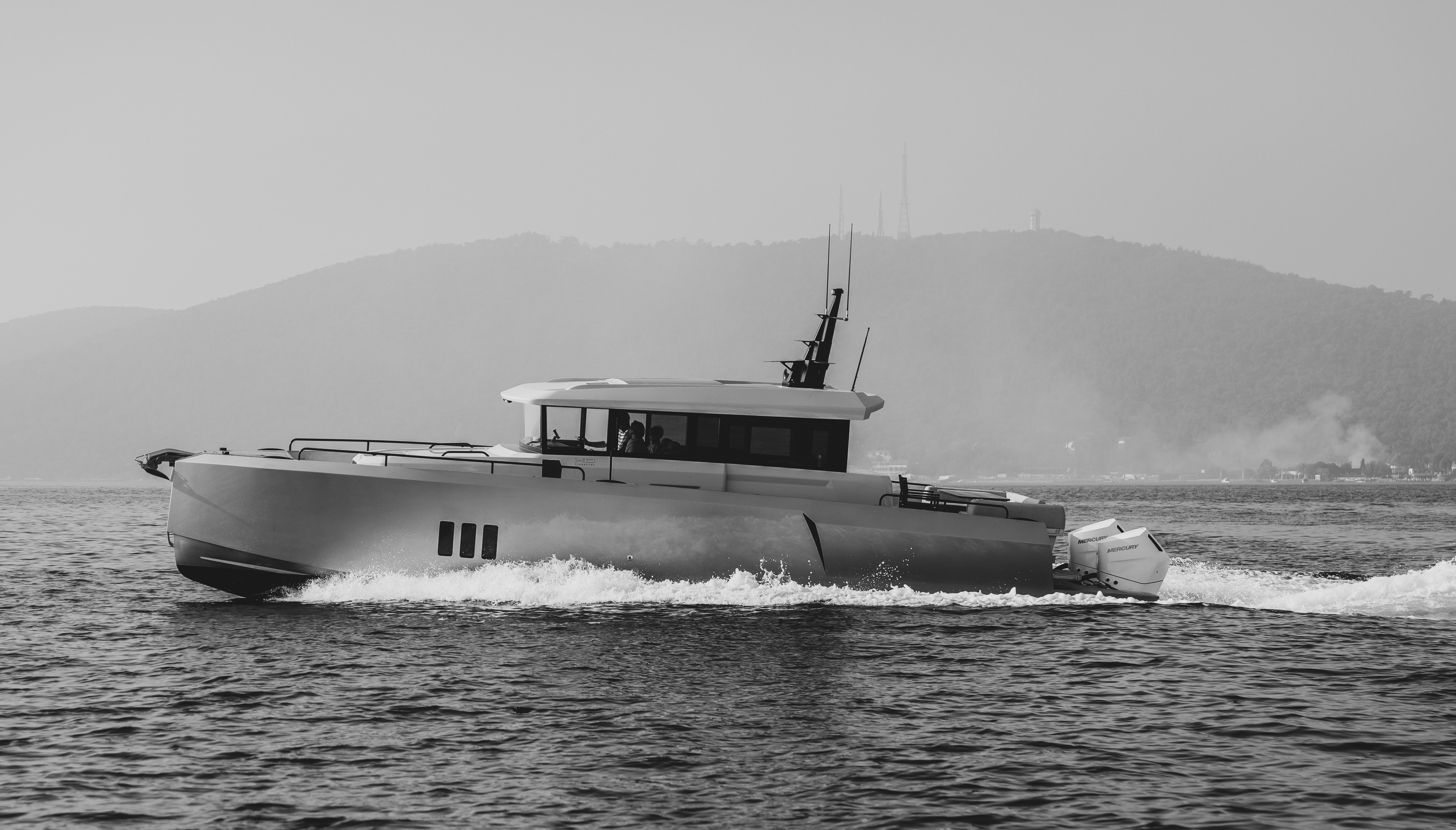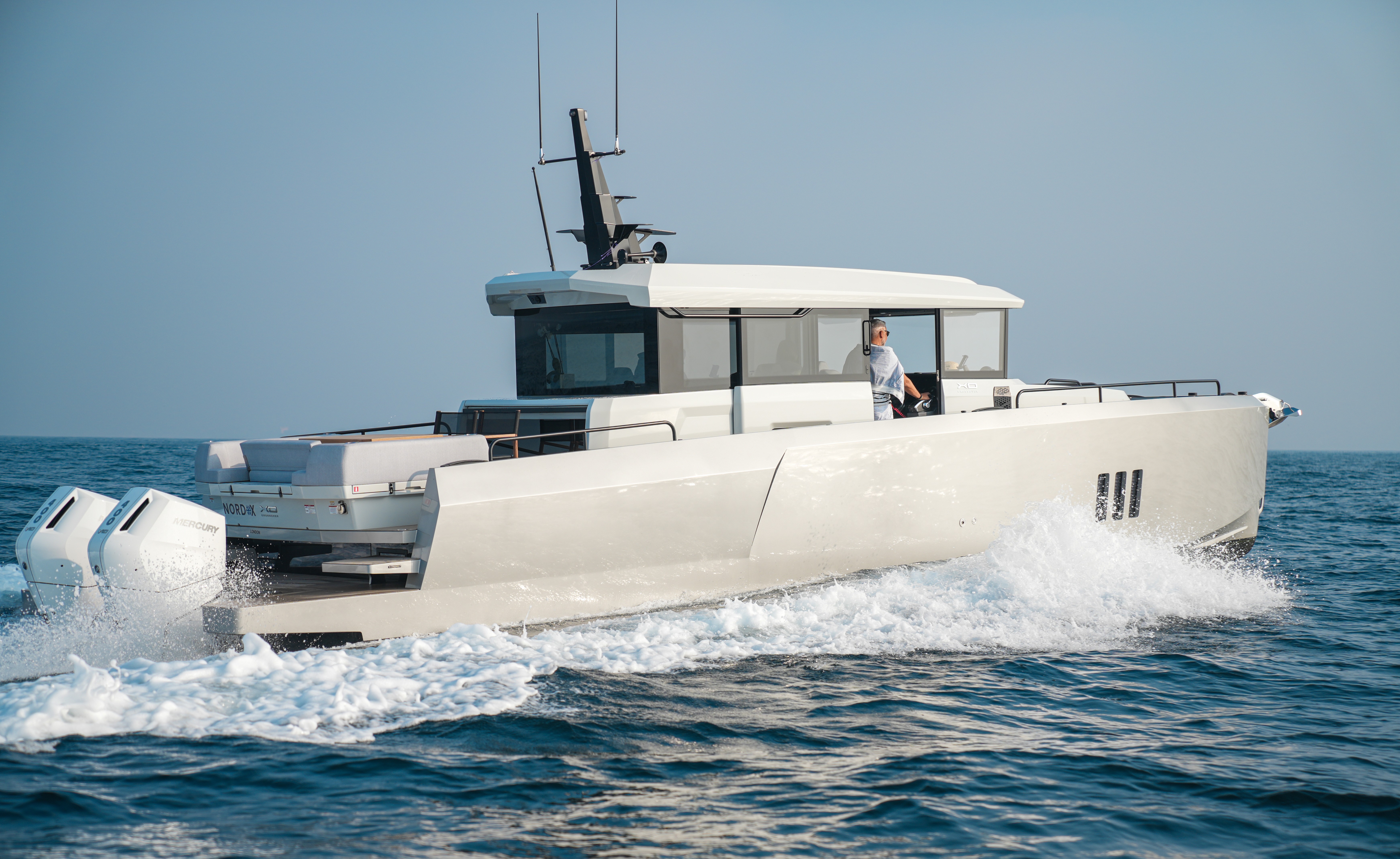 Der er ingen tvivl: XO EXPLR 44 får folk til at kigge. Dens kantede design og mørke vinduesbånd giver et næsten militært udtryk, og de tre store Mercury-motorer på hækken sender et klart signal: Her kommer en, der mener det alvorligt.
