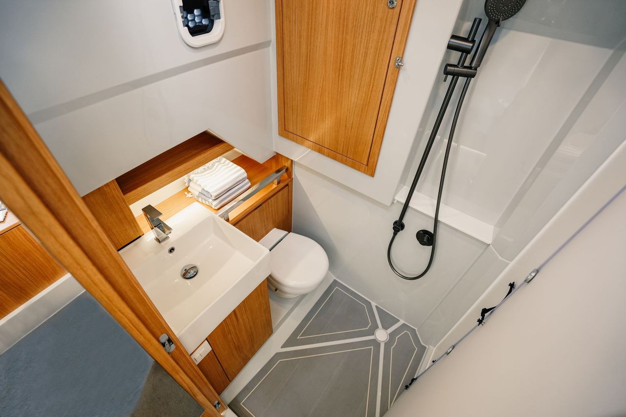 I forkahytten er der en dobbeltseng og eget badeværelse med separat brusekabine. Agter er der gæstekahyt med to køjer og endnu et toilet. Begge rum har god ventilation og rigelig opbevaringsplads.