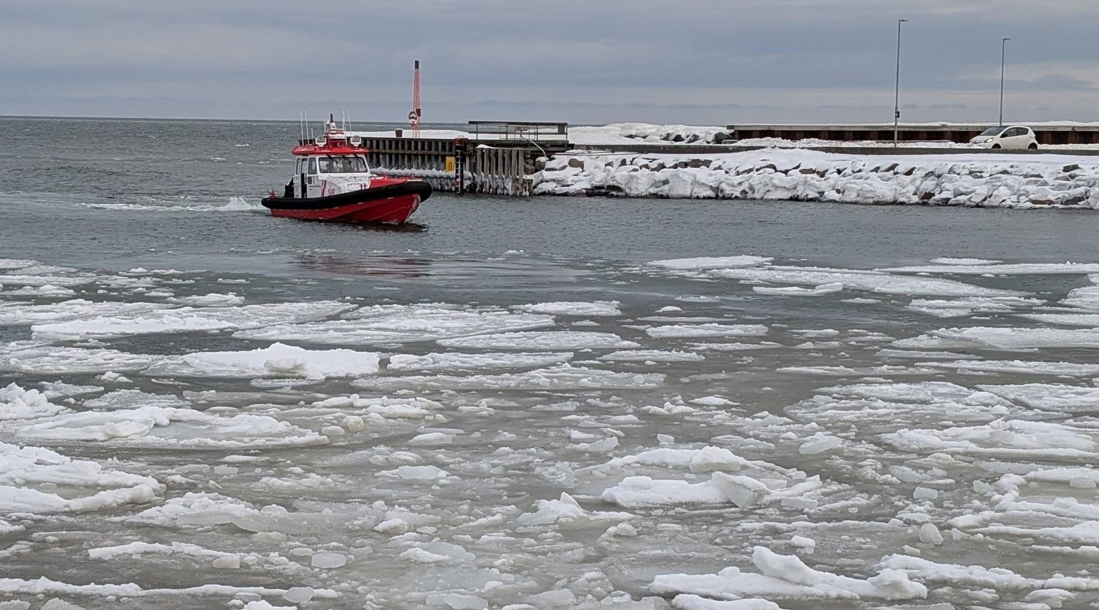 Heldigvis er der begrænset trafik på havet i øjeblikket. Men så længe isen ligger som en tyk bræmme – nærmest som slush ice – må Sæby Redningsstation forblive på land.