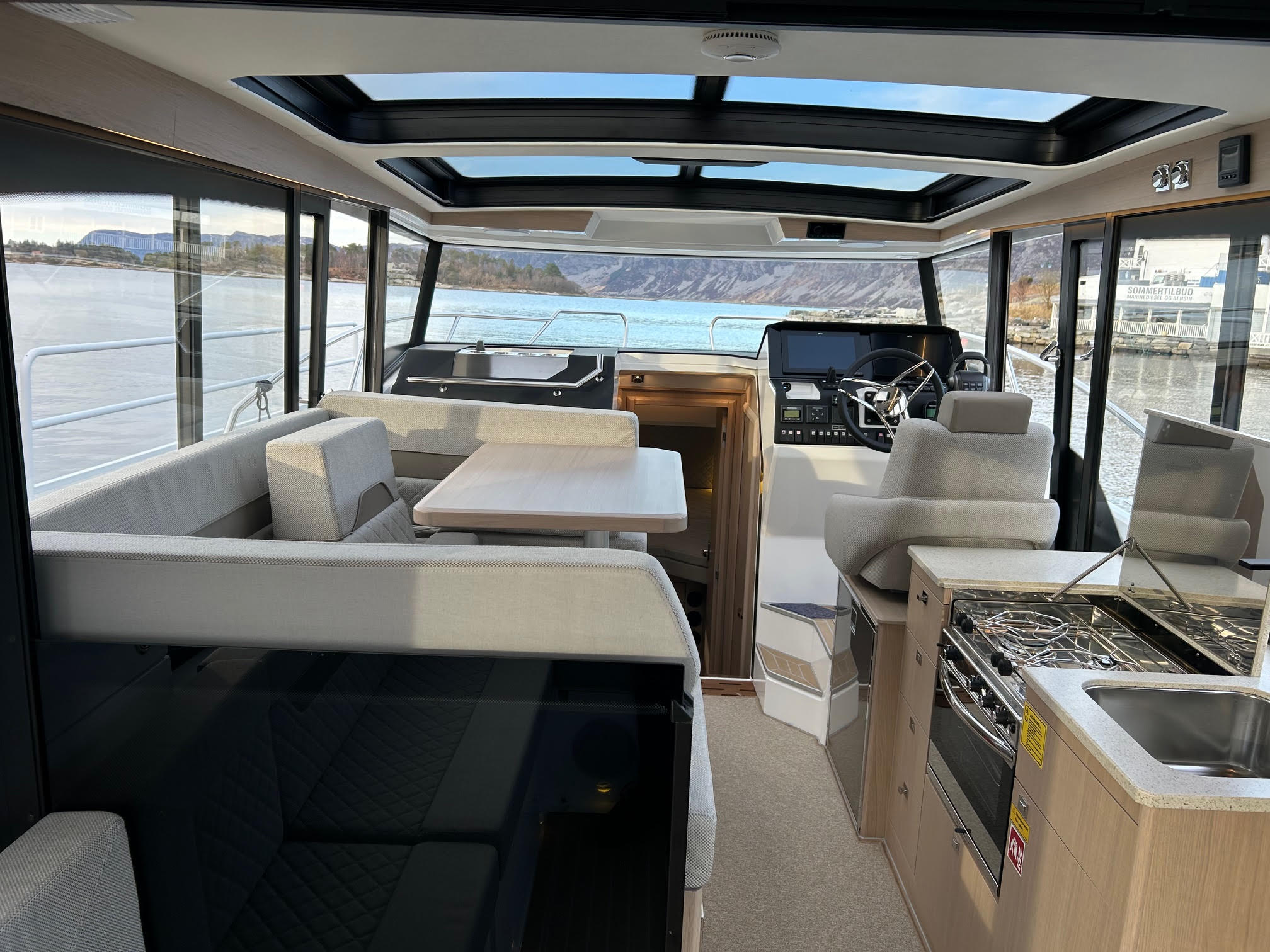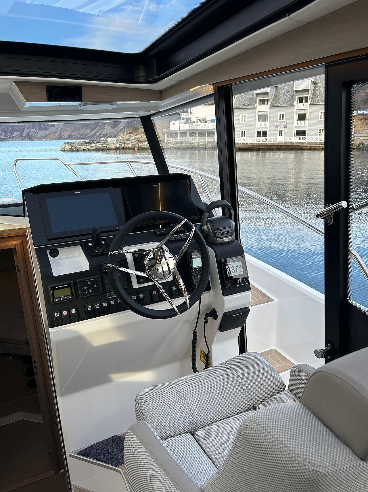 Sidedøre i begge sider gør fortøjning nem og sikker, og walkaround-dækket giver tryg adgang rundt om båden. Agterdæk og salon ligger i samme niveau, hvilket giver en praktisk og niveaufri overgang.