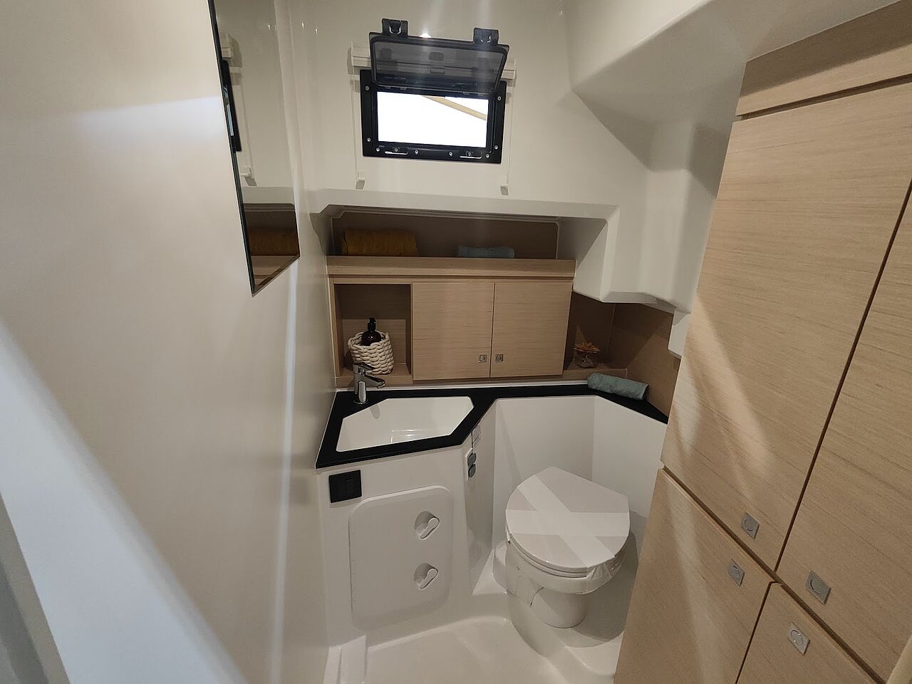 Som ekstraudstyr kan båden leveres med solceller, der forlænger opholdene for anker og reducerer behovet for landstrøm – endnu et element i Delphias fokus på selvforsyning og rolig sejlads.