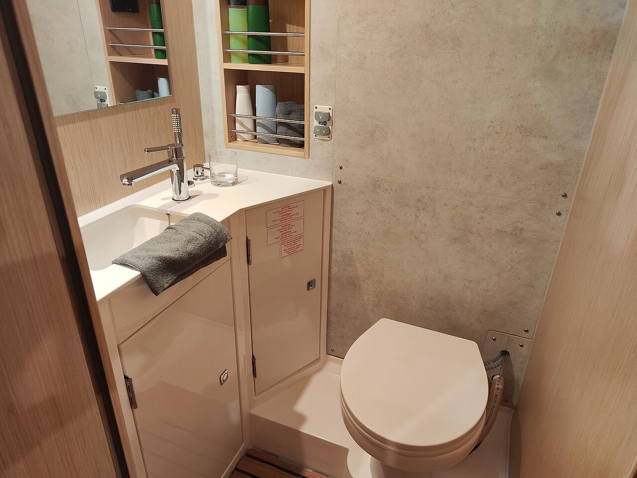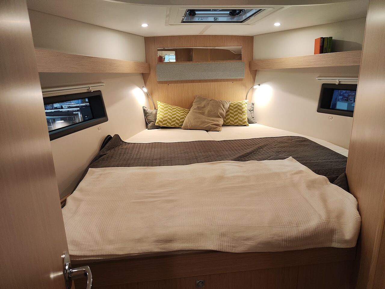 Under dæk finder man tre kahytter med i alt seks sovepladser, ståhøjde på over 195 cm og en finish, der matcher prisklassen. Det er ikke prangende luksus – men solidt, lyst og funktionelt. En båd, der inviterer til at blive ombord.