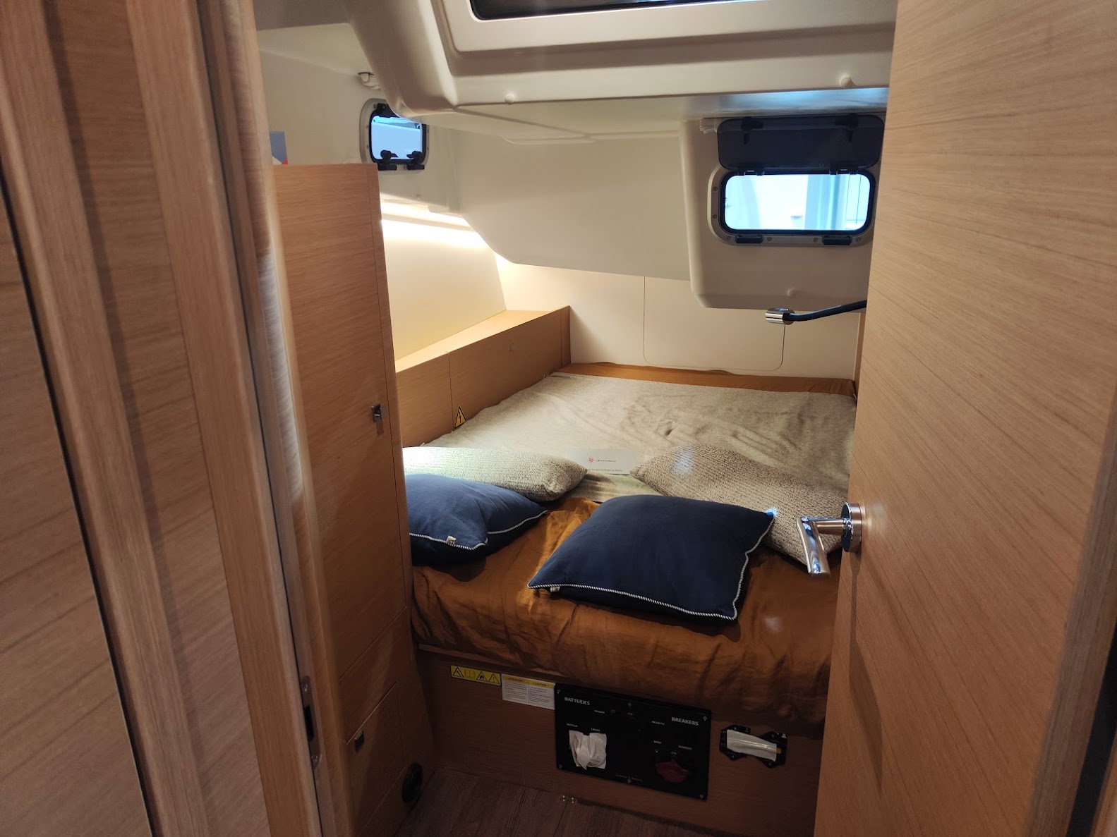 Under dæk er linjerne moderne og lyse. Salonen kan indrettes i flere versioner – fra tre til fem kahytter – og der er mulighed for op til tre badeværelser. Designet er nutidigt med fokus på opholdsrum, hvor op mod ti personer kan samles omkring bordet.