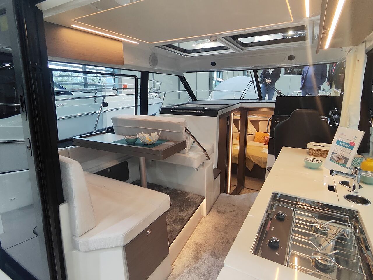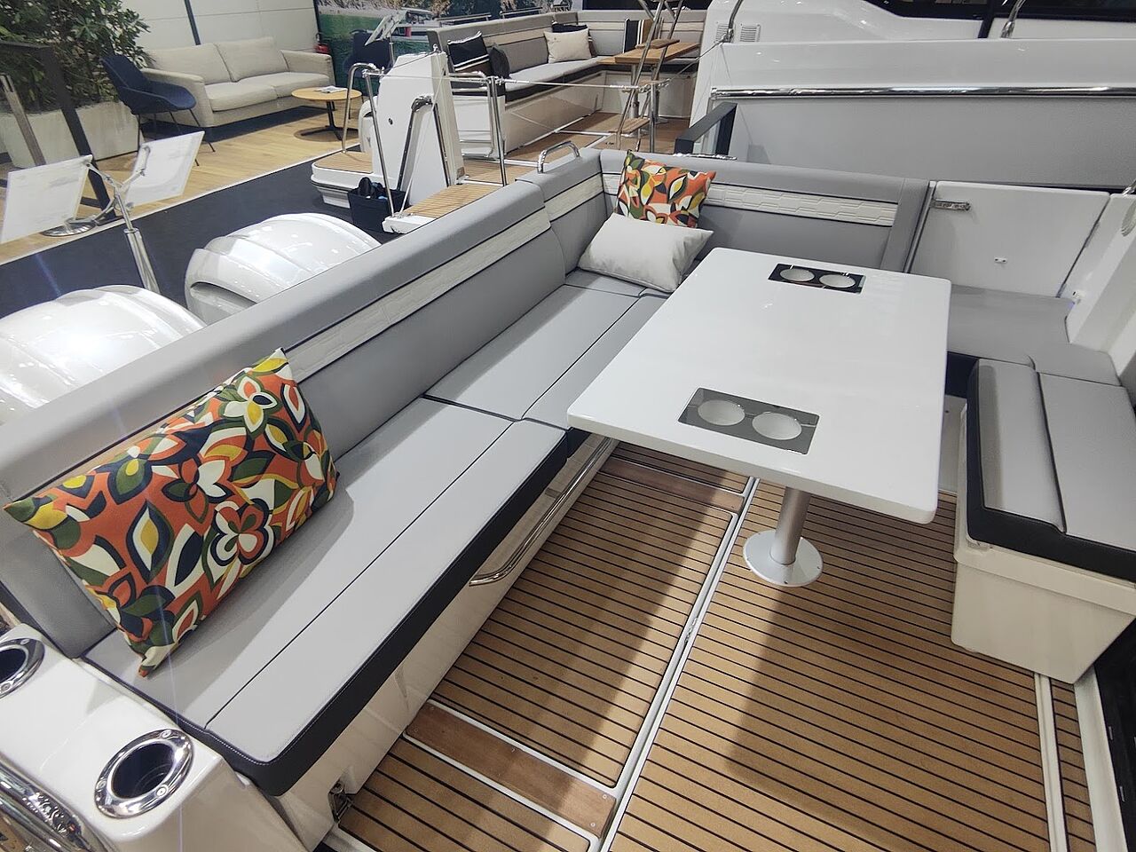 Coupé-versionen adskiller sig fra flybridge-udgaven ved at prioritere ét samlet opholdsrum. Cockpittet er indrettet med en U-formet siddegruppe, som giver mere gulvplads og bedre flow om bord.