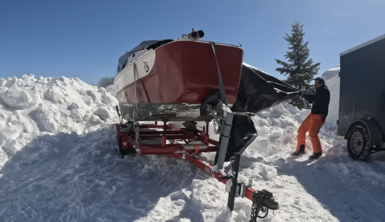 Yann Quenet befinder sig i regionen Abitibi-Témiscamingue, hvor vinteren har været hård. I flere måneder lå temperaturerne under frysepunktet, og båden forsvandt under massive snemængder. Et kort tøvejr har efterladt isen som en ujævn, frossen masse.