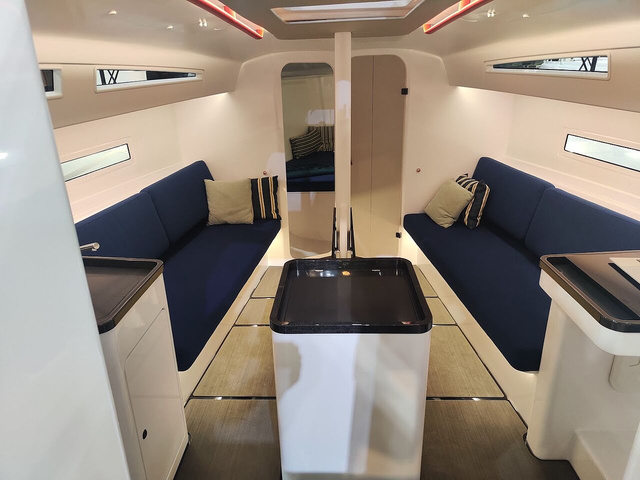 Interiøret er stort set renset for træ. I stedet anvendes lette kompositmaterialer, sandwichkonstruktioner med skumkerne og stoflommer i stedet for tunge skabe. Kahytsnedgangen er udført i kulfiber, og dørke er bygget i letvægts-sandwich. Resultatet er et nøgternt, funktionelt udtryk – og markante vægtbesparelser.
