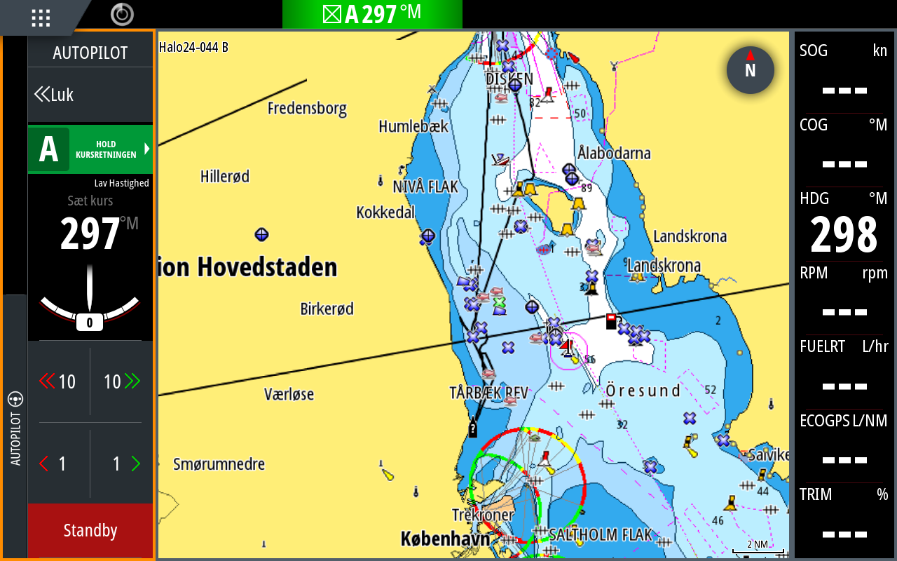 • Den kan følge en hel rute, som enten er manuelt indtastet eller automatisk genereret i søkortplotteren.
