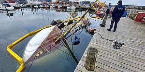 Ved Kent coast i Sydengland gik det galt for et sejlerpar, der blev reddet af Dover Costguard, efter at manden havde dykket under skroget for at finde nødblus.